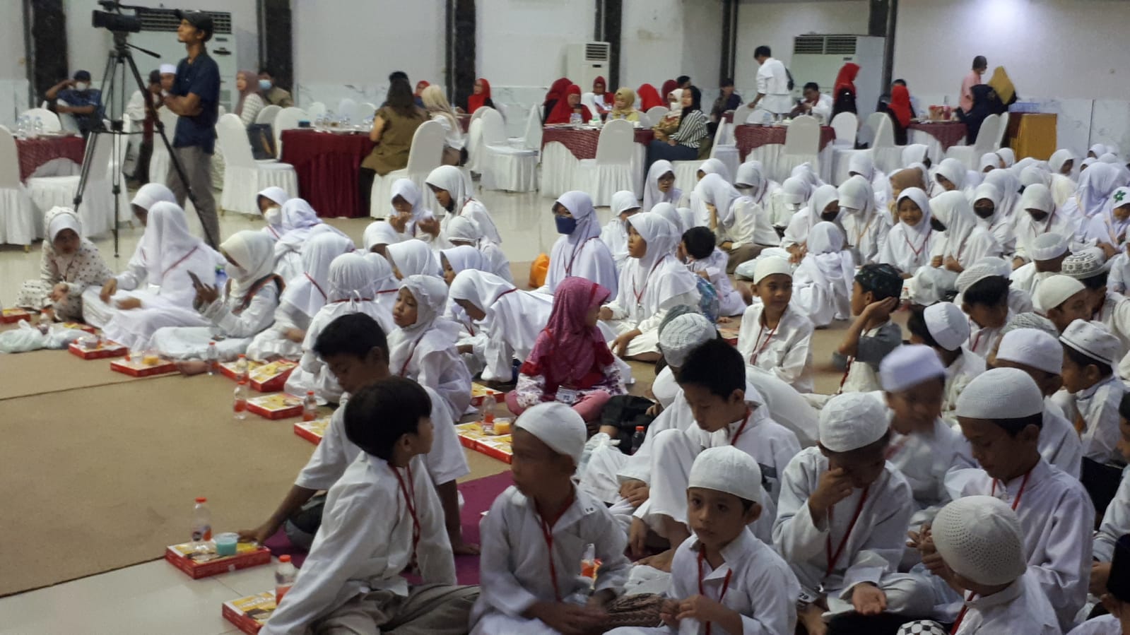 Sebanyak 200 anak yatim dan 100 mualaf disantuni dan buka bersama (bukber) dengan Yayasan Pembina Mualaf AMOI (Aku Menjadi Orang Islam) di Gelanggang Olah Raga Youth Center Jakarta Timur, Jatinegara, Minggu (2/4/2023).