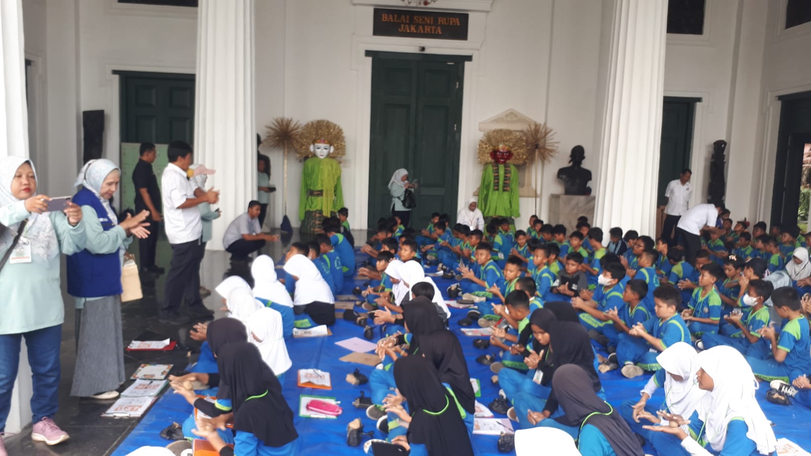 “Mereka anak-anak kelas 4 dan 5 dari SD Negeri 3 Sukatani, Depok. Tadi mereka habis ikut workshop batik di Museum Tekstil terus kemari,” ujar Lia Amalia, Kepala Sekolah SDN 3 Sukatani. Delapan guru ikut mengawal murid-murid sekolah tersebut.