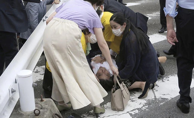 NHK menyatakan, reporternya mendengar suara tembakan dua kali, sebelum Abe tersungkur, memegang perutnya yang berdarah.