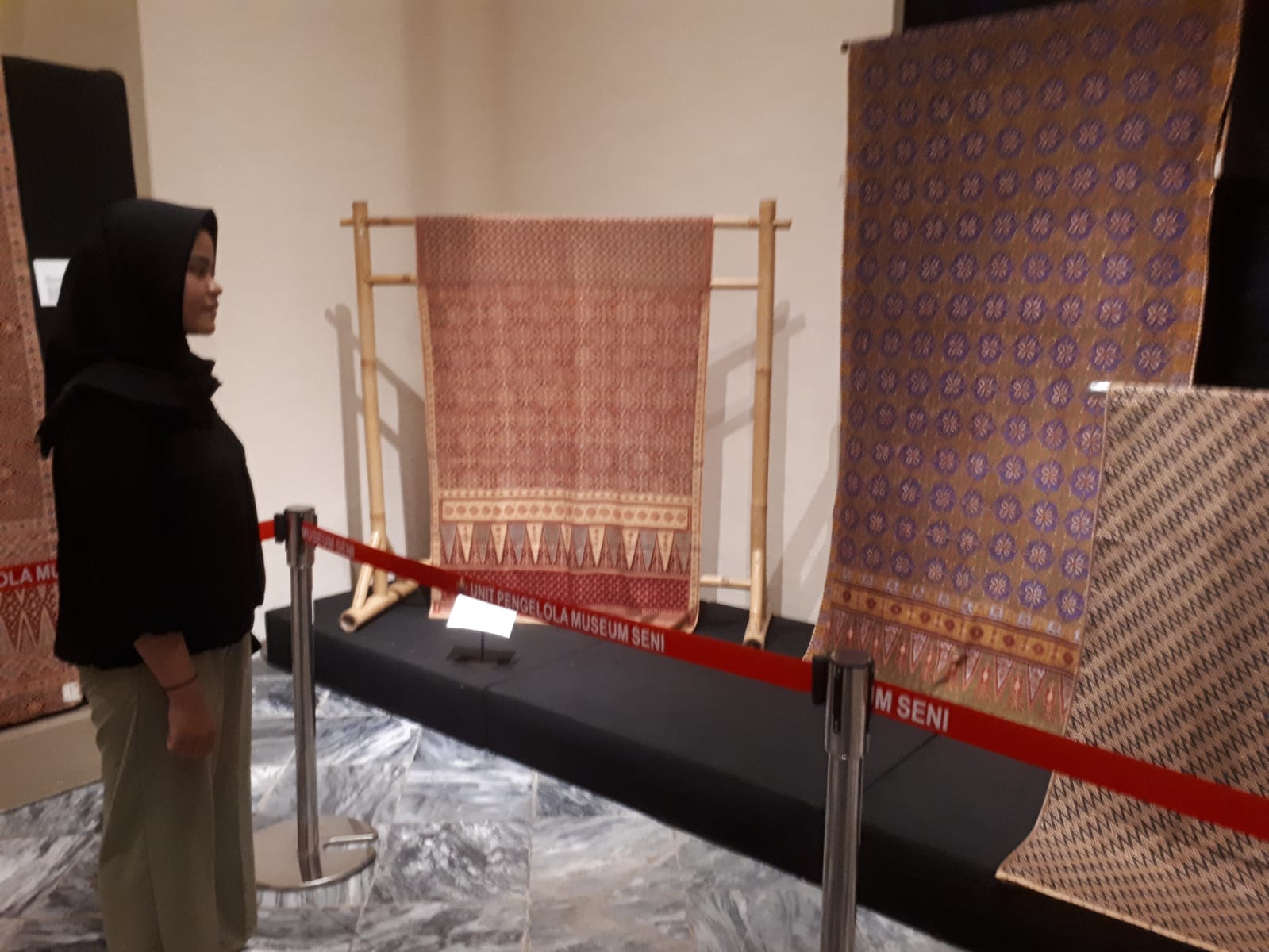Ny Titik Soewarno seorang pengunjung dari Duren Sawit Jakarta Timur mengamati batik Jlamprang warna merah tampak tekstur kainnya halus sekali.