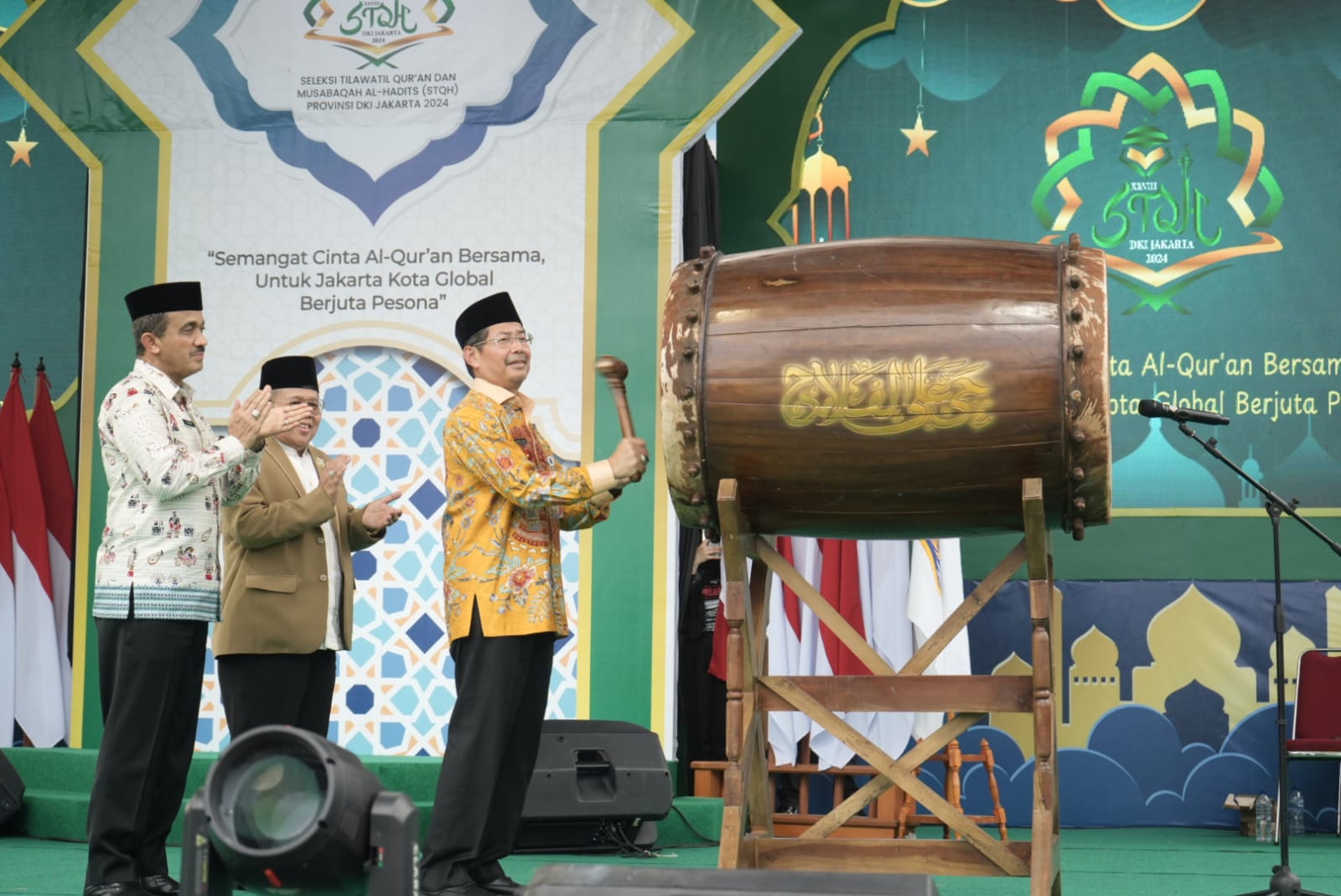 Pembukaan STQH DKI Jakarta dilakukan dengan pemukulan bedug oleh Sekretaris Daerah (Sekda) Provinsi DKI Jakarta H Marullah Matali, bersama Wali Kota Jakarta Timur Muhammad Anwar di halaman kantor Wali Kota Jaktim, Jumat (15/11/2024).